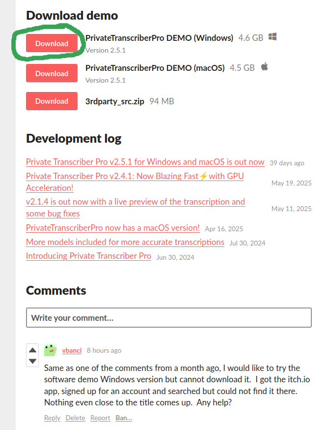 Same as one of the comments from a month ago, I would like to try the software demo Windows version but cannot download it. I got the itch.io app, signed up for an account and searched but could not find it there. Nothing even close to the title comes up. Any help?